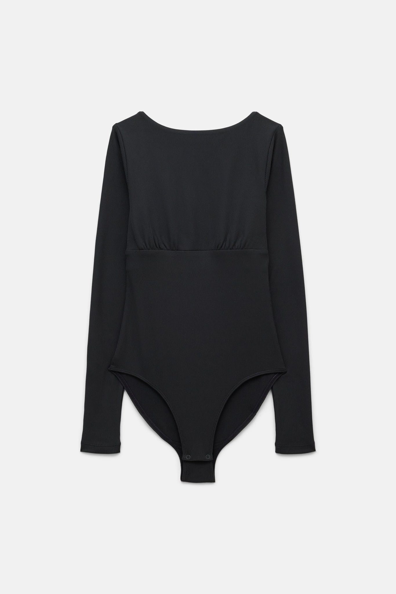 A balletcore FLOAT bodysuit for dancey workouts and every day styling. Complete with long sleeves, support band, and a deep u-back so you can move easy.