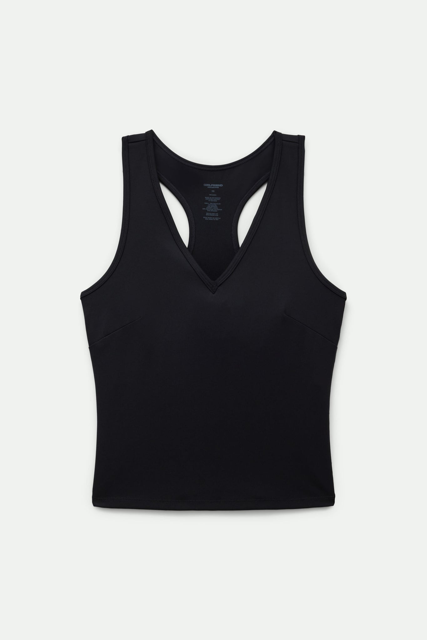 Strike a sporty-prep balance in this Compressive v-neck tank with a built-in bra and removable cups.
