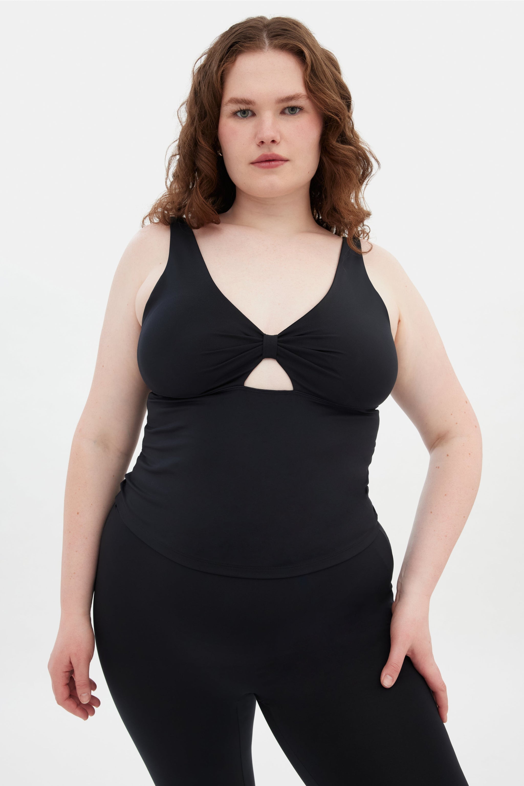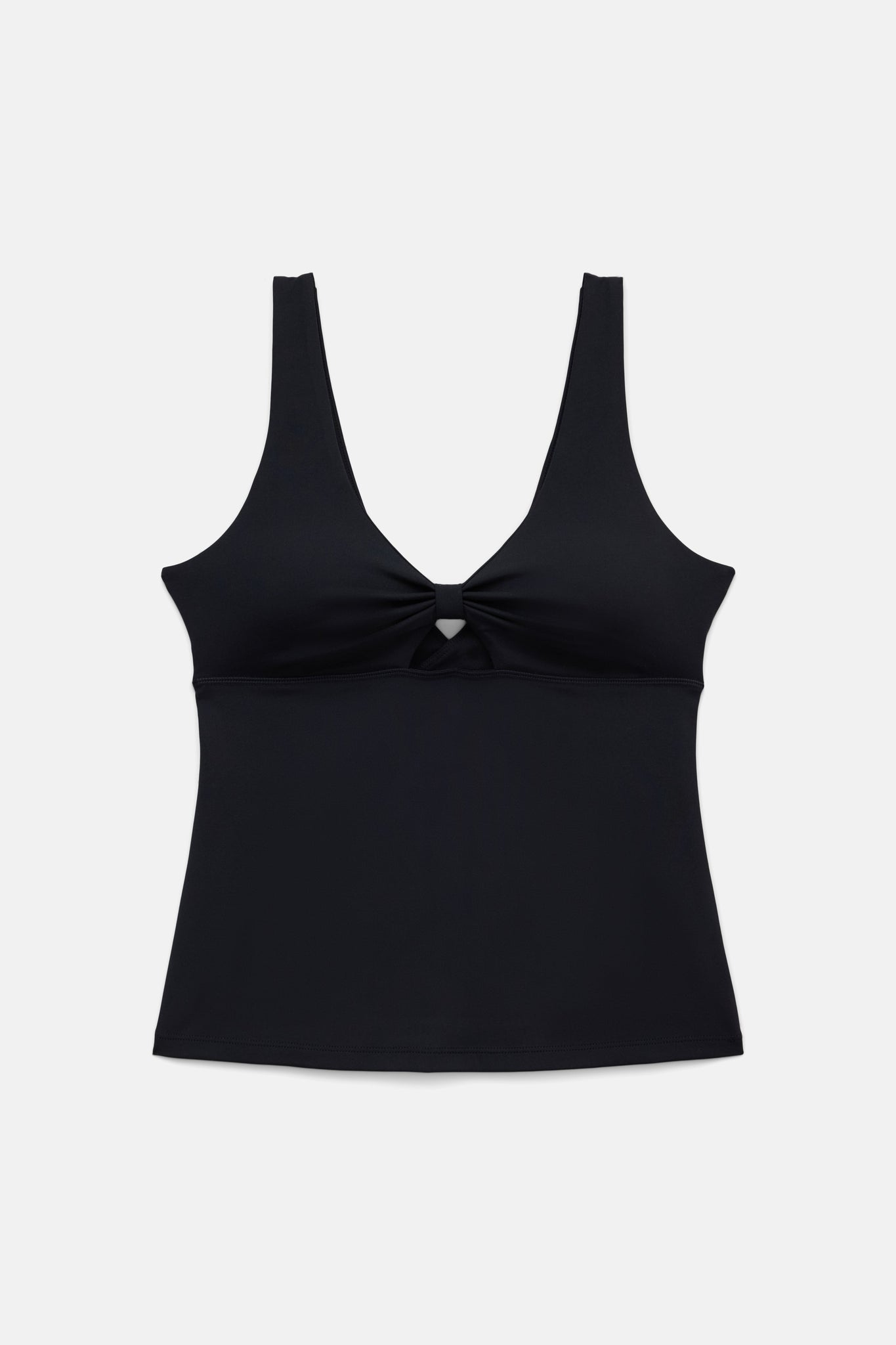 A full length workout tank with a bow cutout and low back.