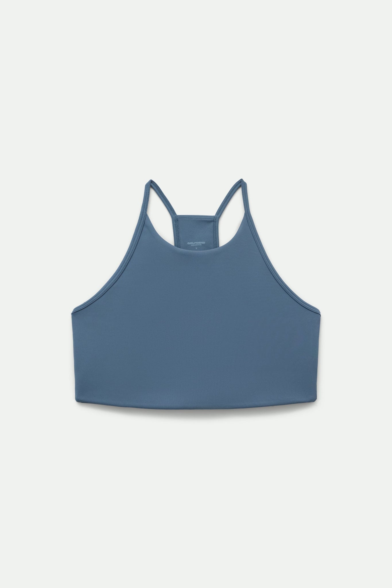 A high neck halter sports bra with a plush feel and subtle matte sheen. Wear it to work out or throw it on under a blazer for a fancy dinner.