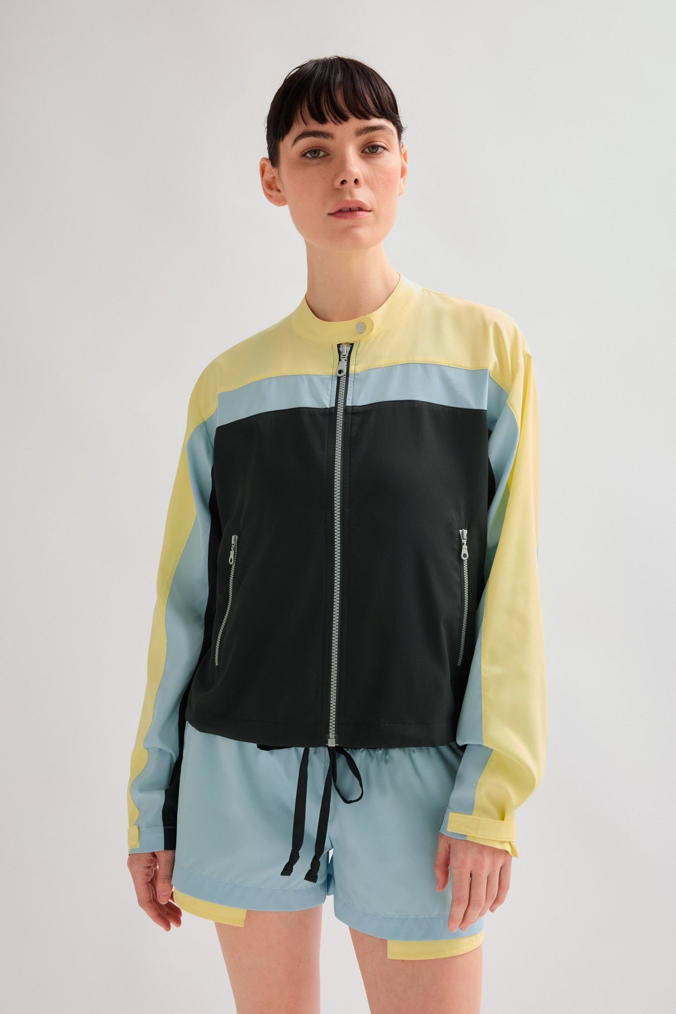 I love this racer style - I was looking at a leather jacket with this exact design but but this is so much better. light weight enough for year-roud wear and stylish enough to wear out. people don't realize it's a windbreaker and i get so many compliments. it folds up easily into a small purse if I get too hot. i love it.