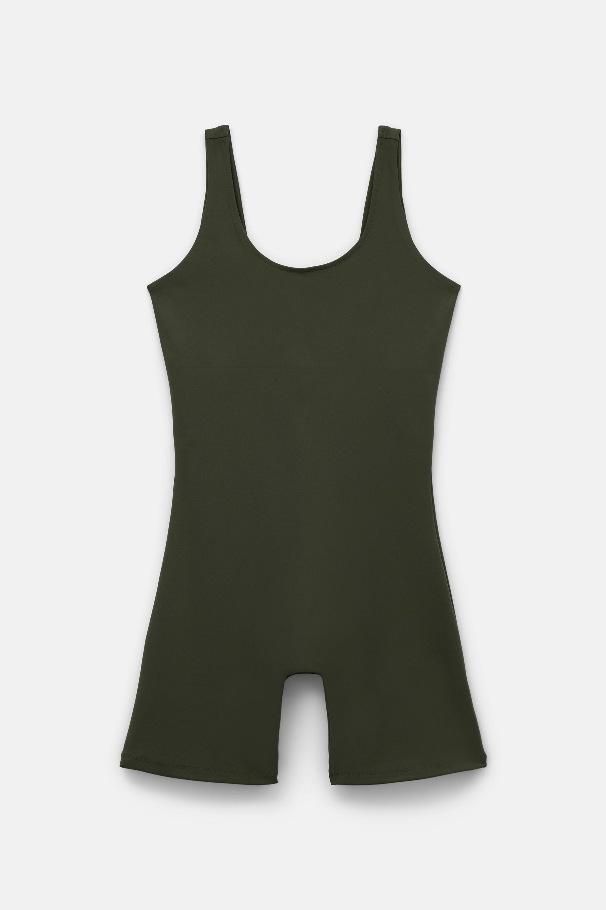 A bike short-length compressive unitard with a scoop neck, low back, and built-in bra.