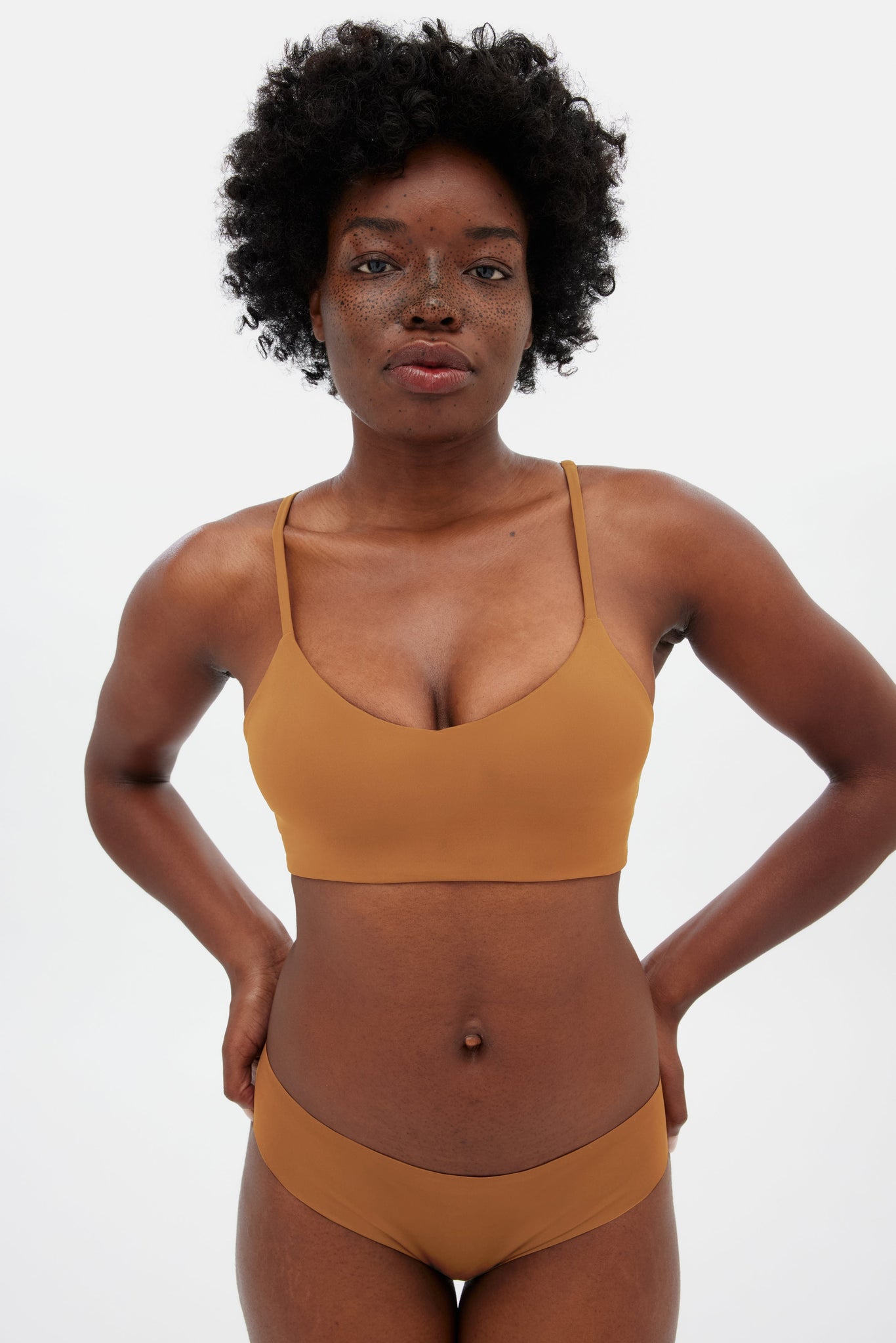 A soft, second-skin fabric crafted with recycled materials, delivering breathable comfort and minimal lines all day long.
