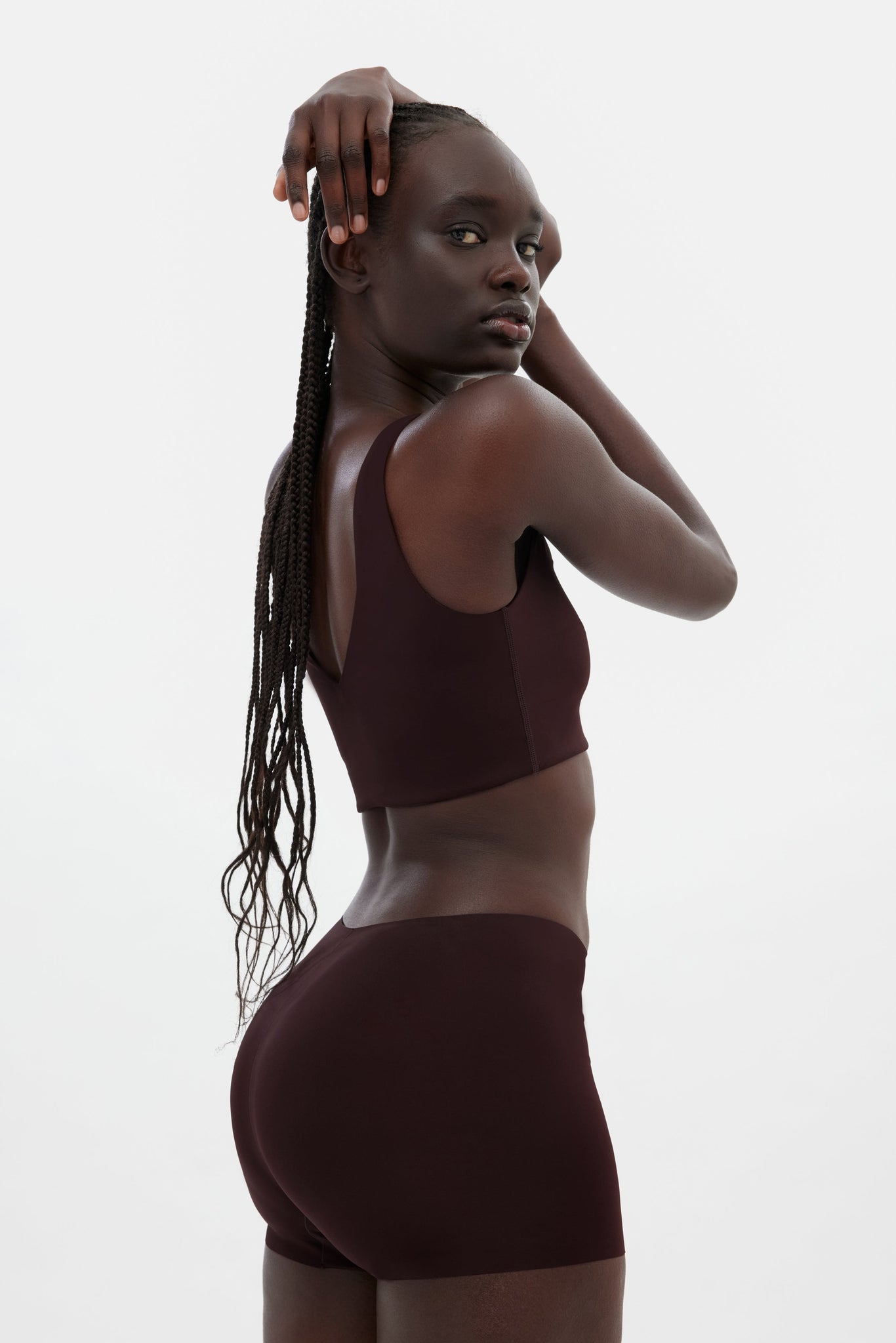 A soft, second-skin fabric crafted with recycled materials, delivering breathable comfort and minimal lines all day long.