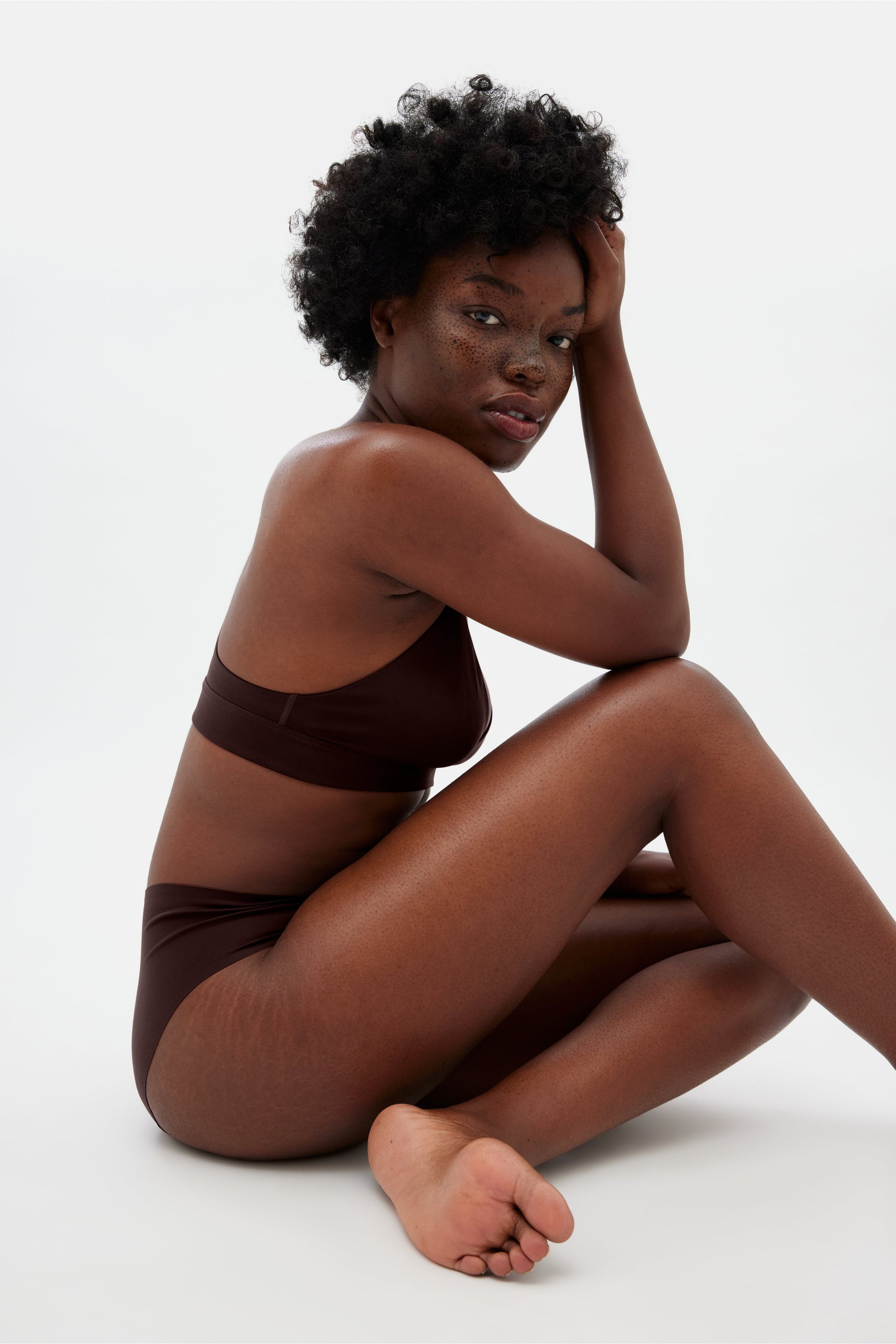 A soft, second-skin fabric crafted with recycled materials, delivering breathable comfort and minimal lines all day long.
