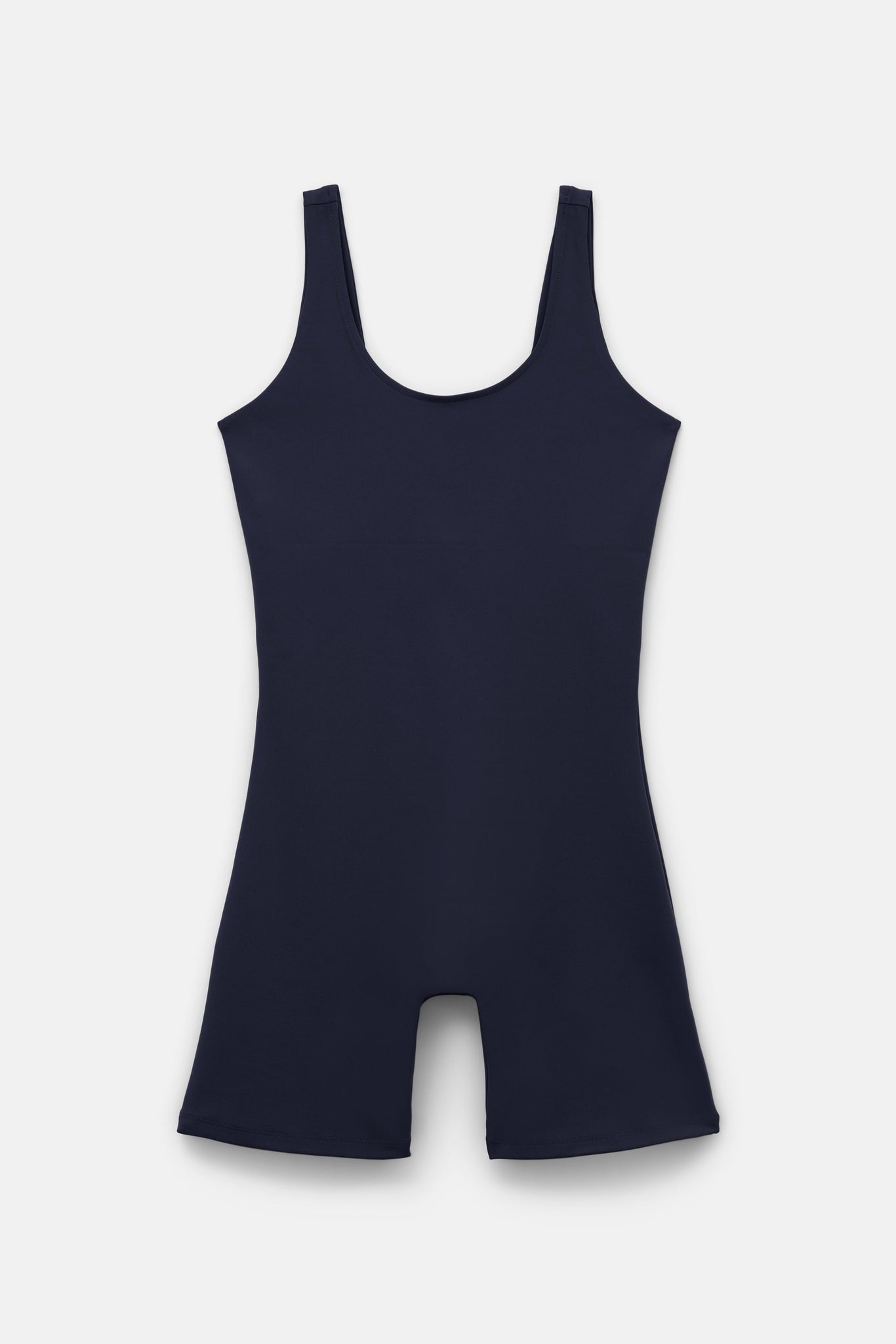A bike short-length compressive unitard with a scoop neck, low back, and built-in bra.