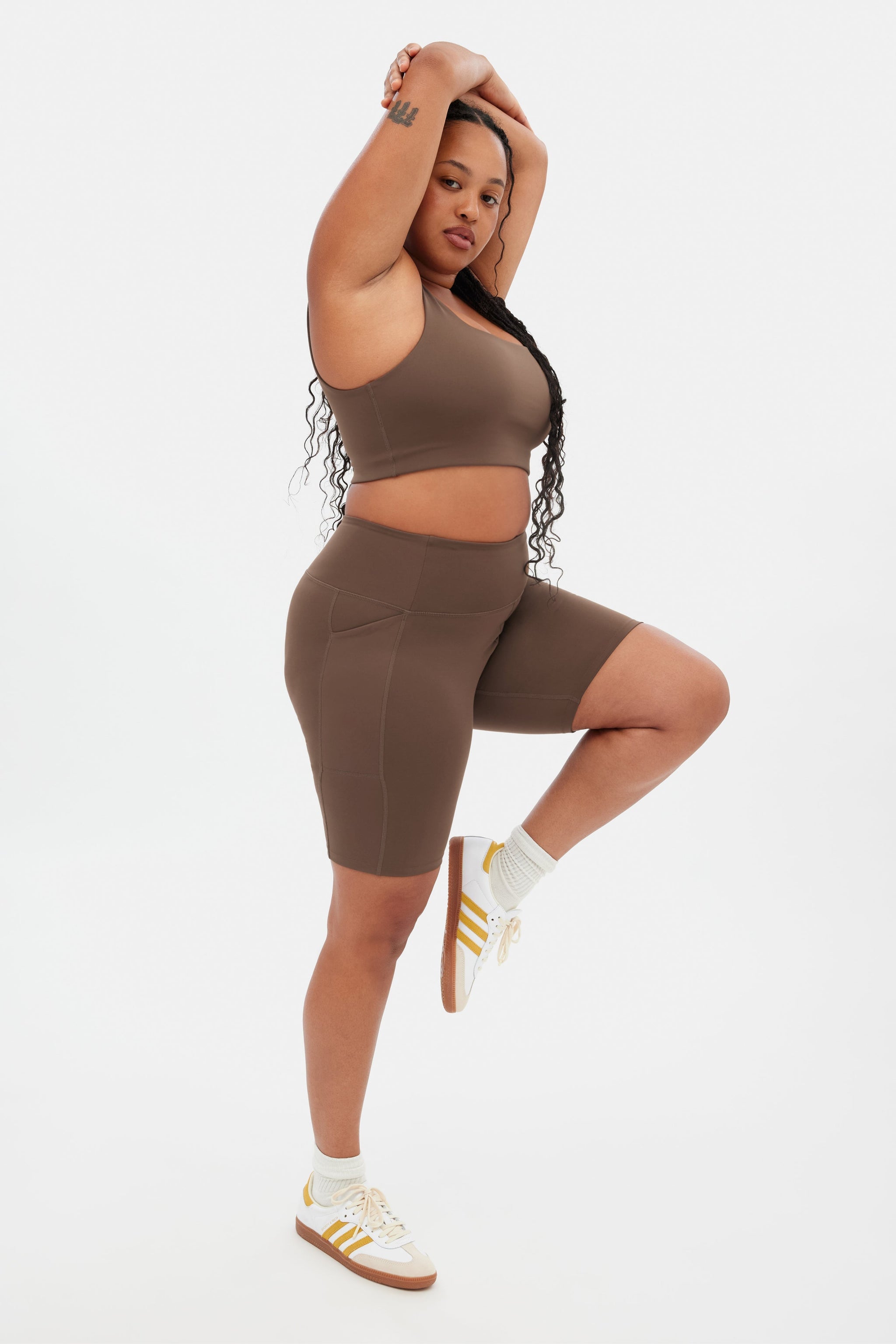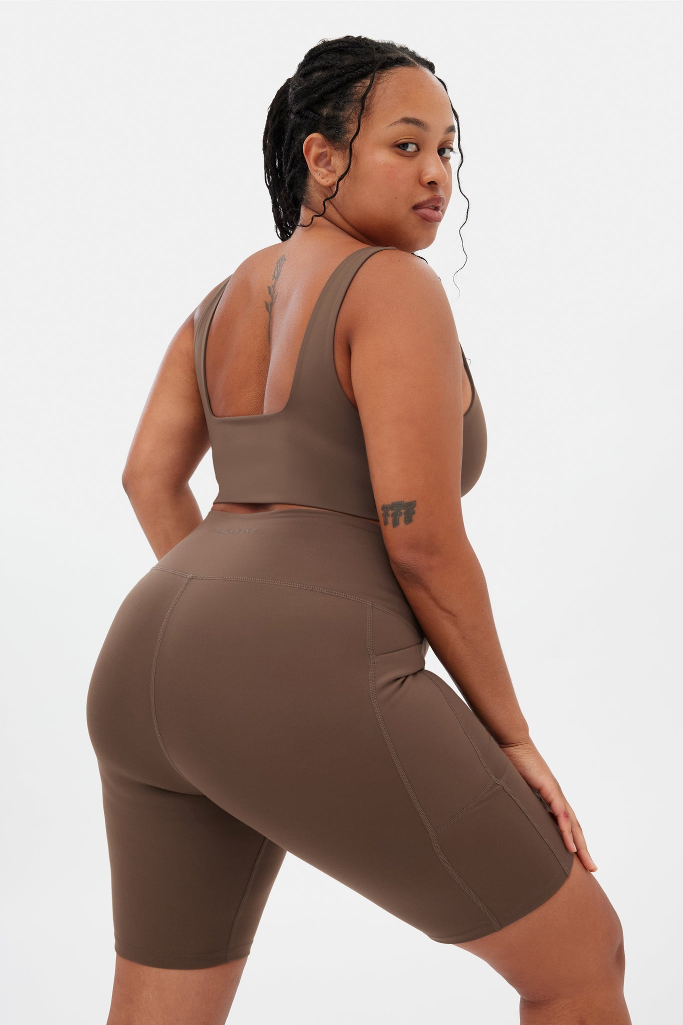 Compressive bike shorts that have a high rise, 8.5” inseam, and you guessed it — pockets.