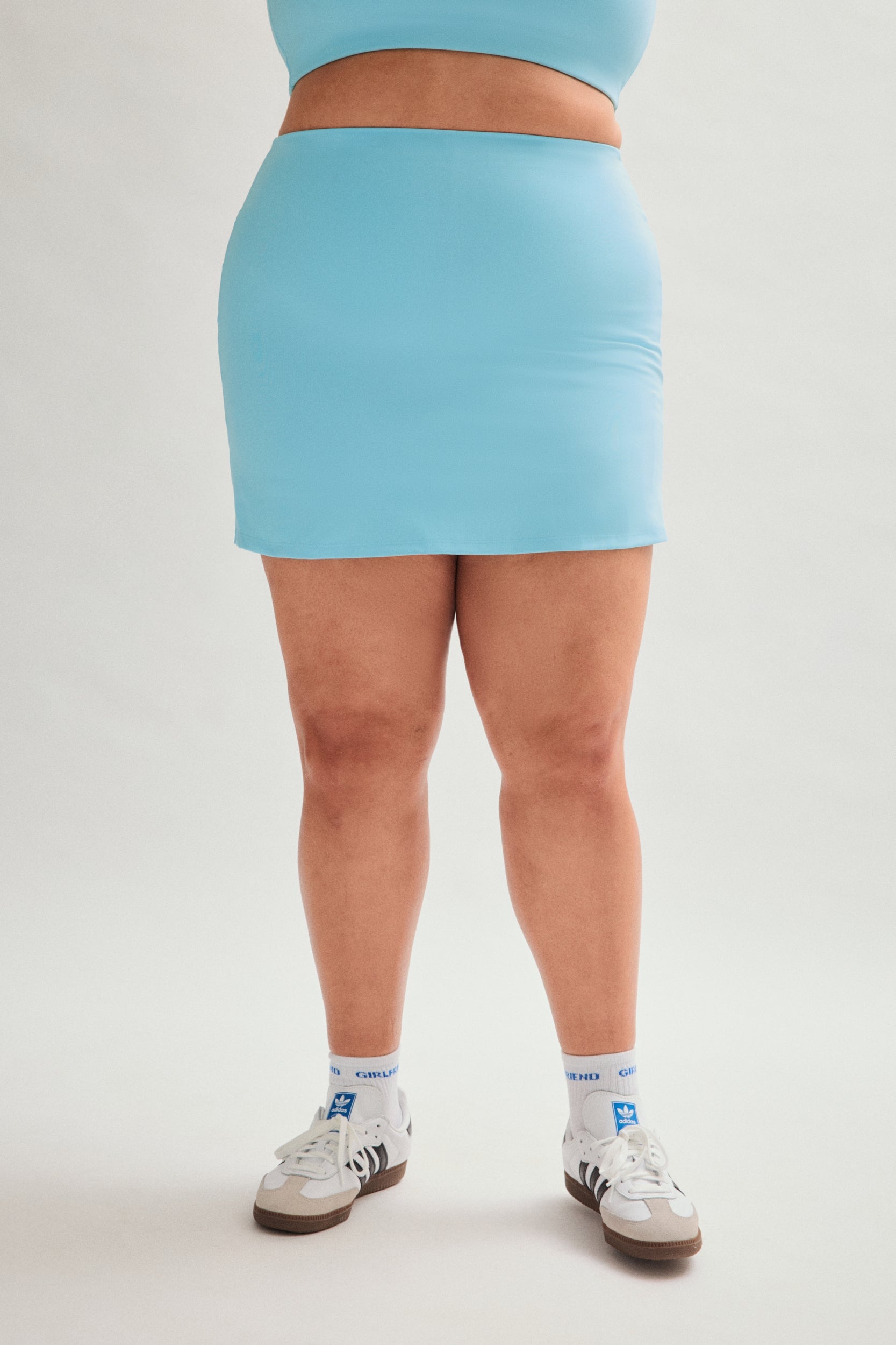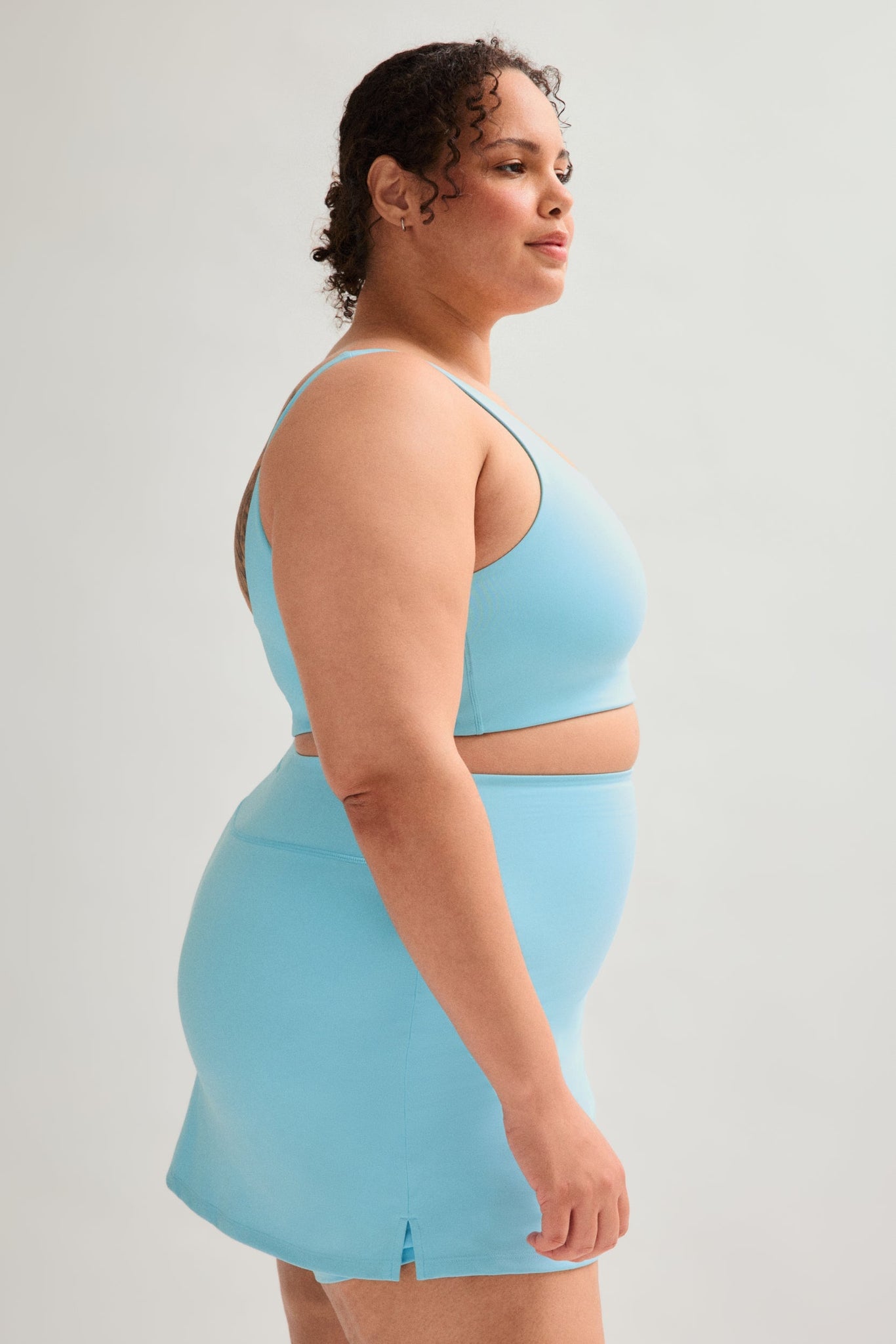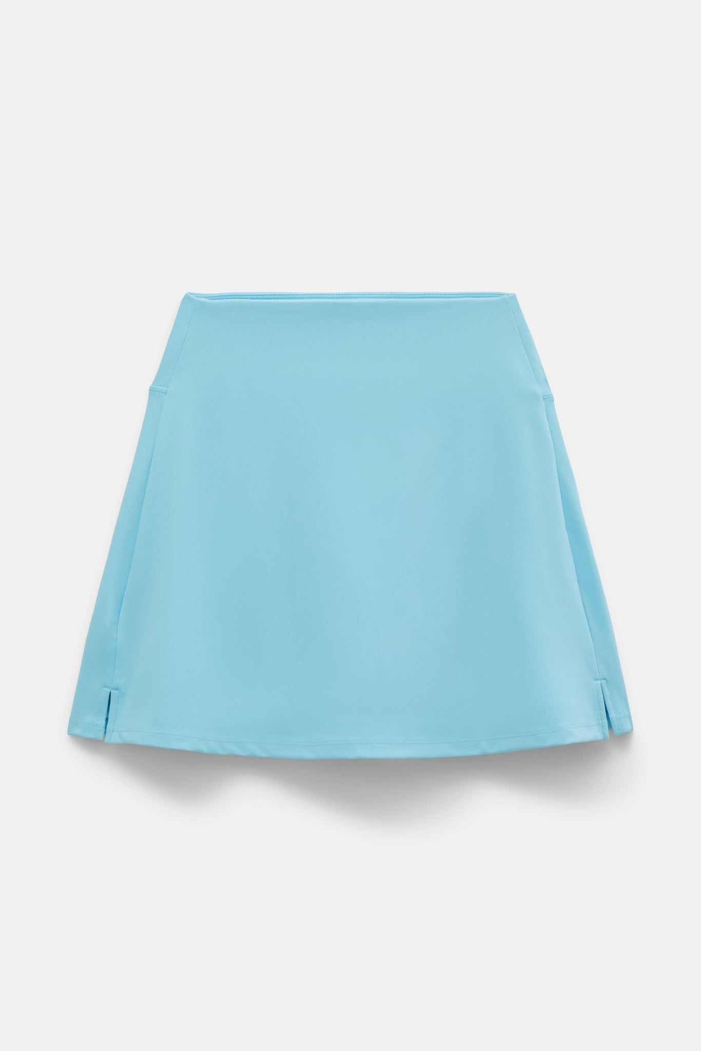A sporty high rise exercise skirt with built-in compressive shorts, hidden mesh pockets, and side slits for easy moving.
