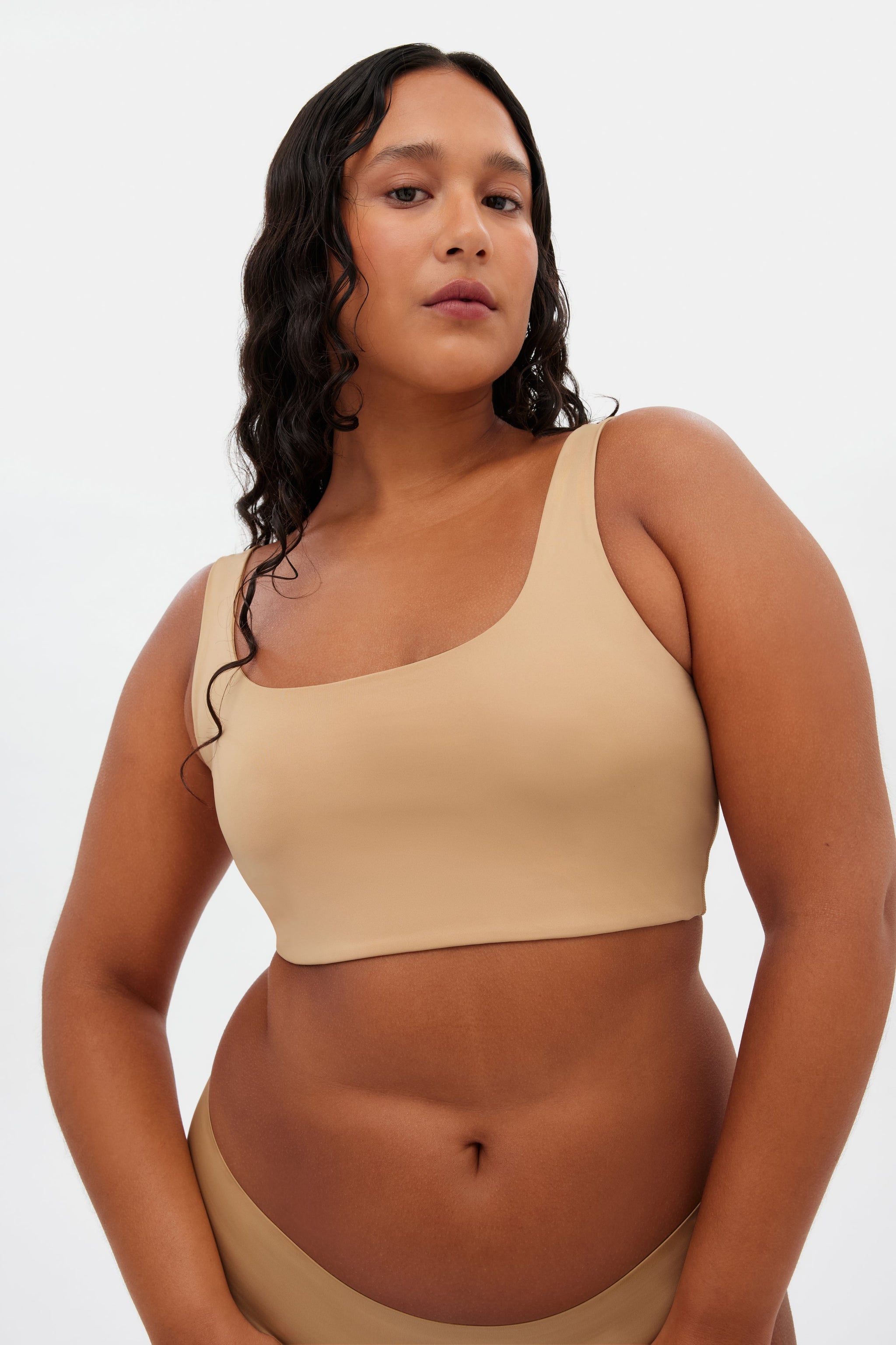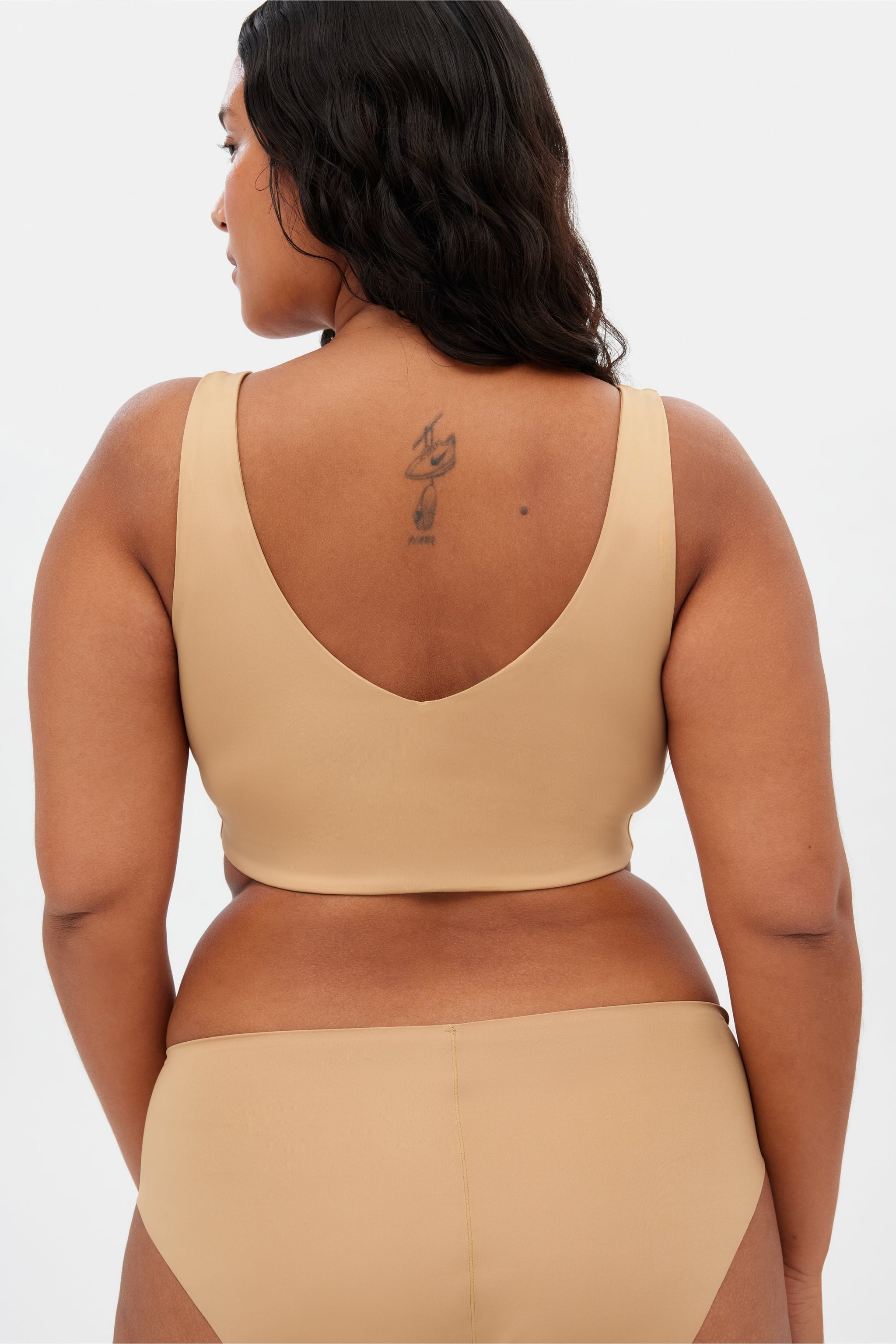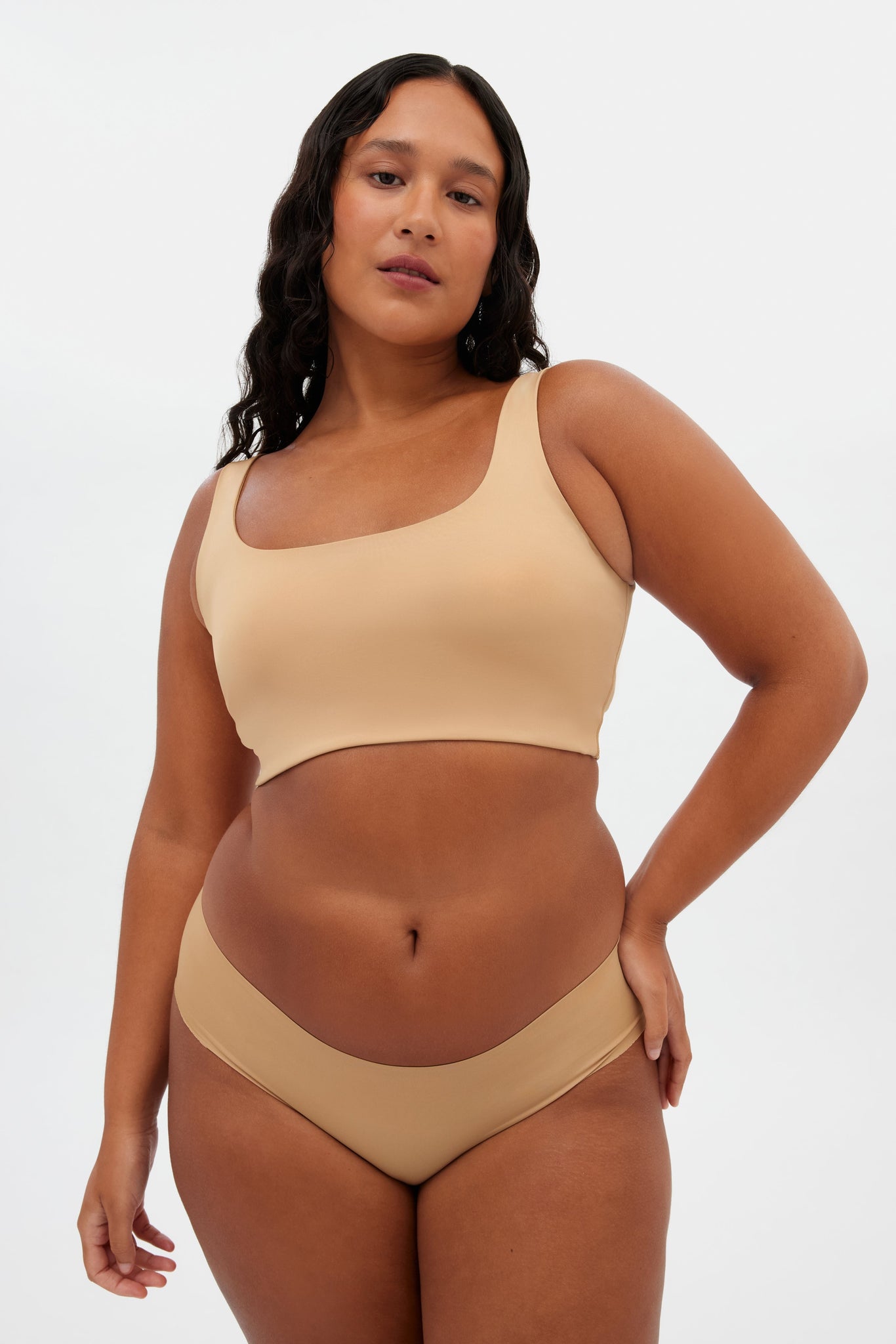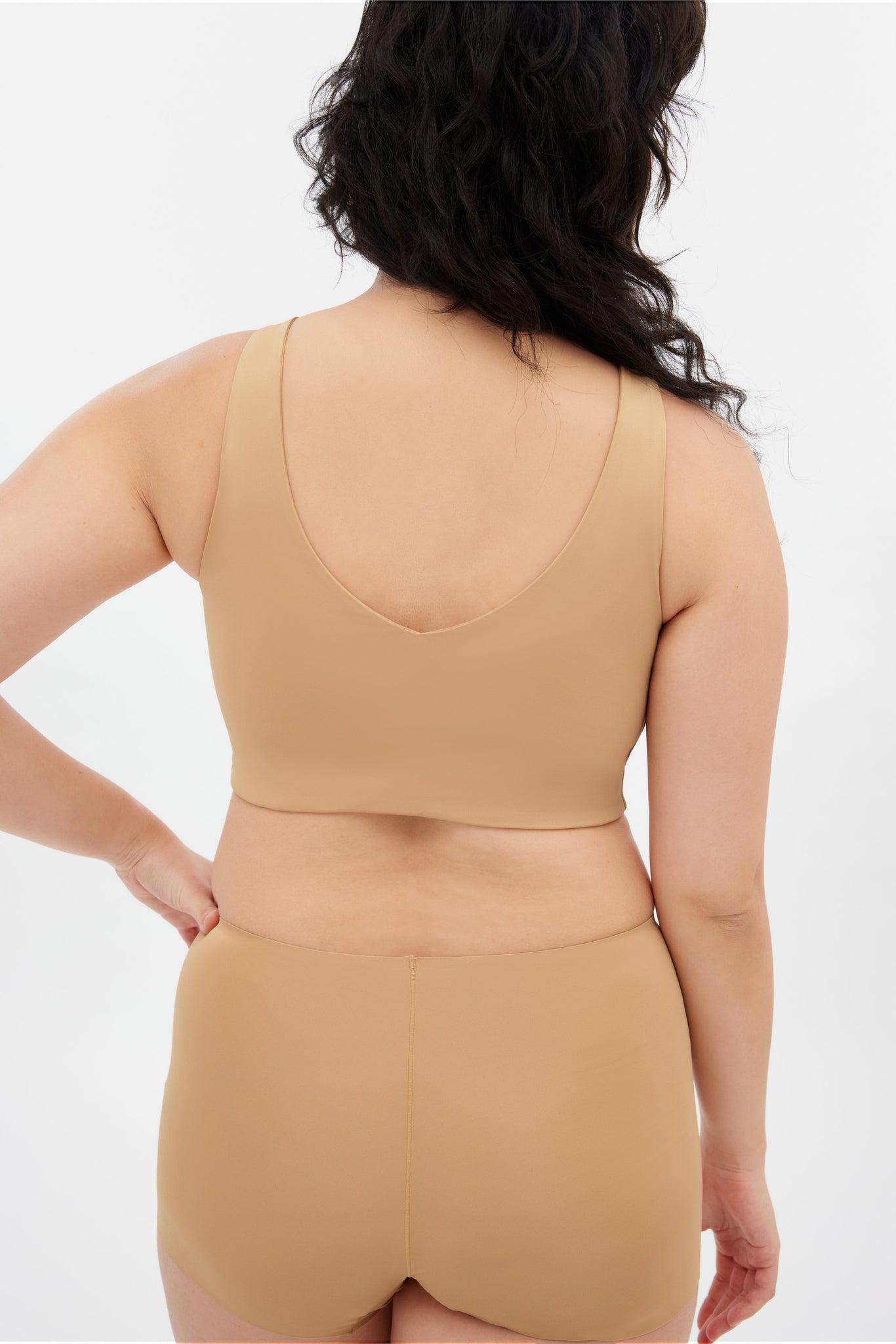 A soft, second-skin fabric crafted with recycled materials, delivering breathable comfort and minimal lines all day long.
