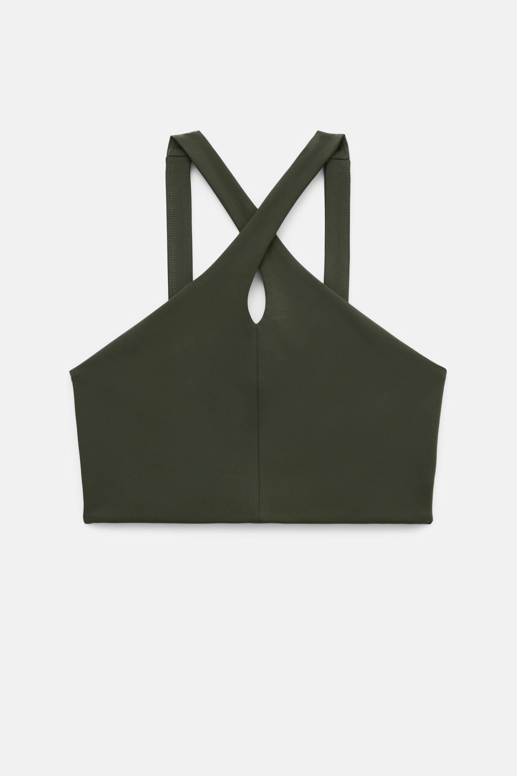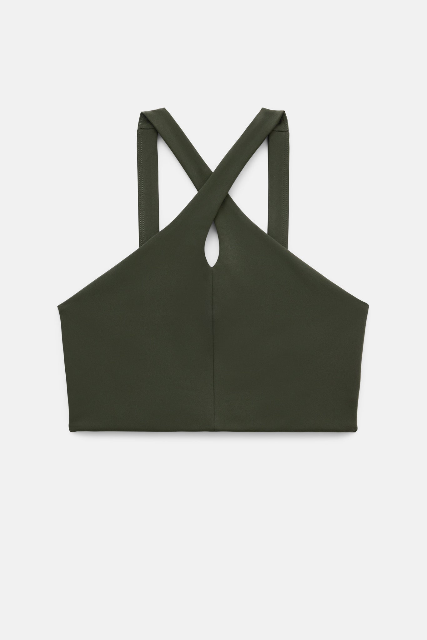 A halter neck style sports bra with a small front keyhole and breathable back design.